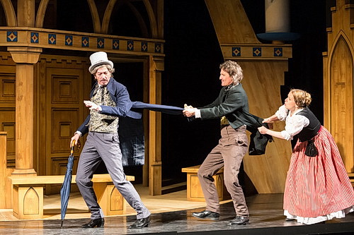Huhn belässt das Stück in der vorge­ge­benen Zeit um 1850 und insze­niert es ganz tradi­tionell, aber in sich stimmig mit viel buntem Treiben, Tanz und Lokal­ko­lorit. Das Bühnenbild von Thilo Staudte ist ein echter Hingucker. Es stellt eine mehrstö­ckige erzge­bir­gische Pyramide dar, auf der die Dörfler, verkörpert durch den verstärkten, enorm spiel­freu­digen Chor, zu Beginn postiert sind.
