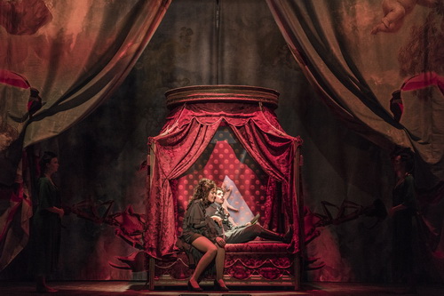 Wer aller­dings des Italie­ni­schen mächtig ist, wird an dem Abend umso mehr Spaß haben, denn die Sänger­dar­steller singen – und sprechen – ausge­sprochen textver­ständlich. Was der Altistin Candia Guida keine Schwie­rig­keiten bereiten kann, darf sie doch in ihrer Mutter­sprache singen respektive sprechen. Ihre Marquise de Merteuil wartet mit wunder­baren tiefen Registern auf, was bei den Kolora­turen erst mal etwas gewöh­nungs­be­dürftig klingt. Überhaupt ist es ein Abend der ungewöhn­lichen Stimmen. Als scheinbar großer Verführer Vicomte de Valmort tritt der Counter­tenor Yosemeh Adjei mit blonder Löwen­mähne und immer wieder gern entblößtem Oberkörper in Erscheinung. Seiner Stimme werden nicht die ganz großen Höhen abver­langt, was angesichts einer zweiein­halb­stün­digen Aufführung sehr angenehm ist. In der Höhe glänzen kann und darf hier der zweite Counter­tenor des Abends, Maayan Licht. Als Chevalier Danceny entzückt er mit lupen­reinem Sopran – und einem kurzen Nackt­auf­tritt. Sopra­nistin Stefanie True überzeugt voll und ganz als 15-jährige Cécile Volange mit jugend­licher Stimme und nicht-kindlichem Auftritt.