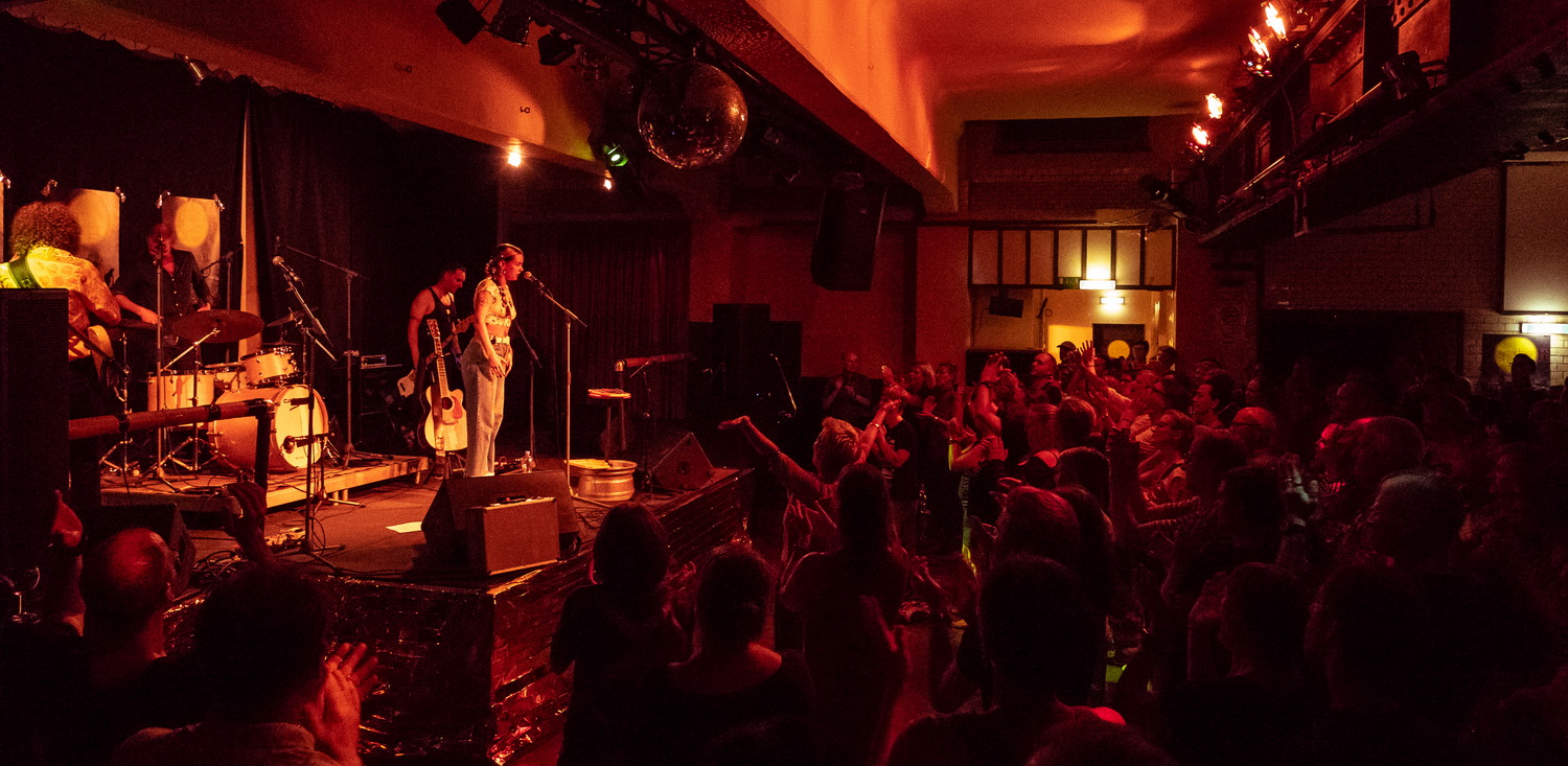 Bei der Namensgebung wird beim Asphalt-Festival gern mal ein bisschen hochgegriffen. Und so ist der Konzertsaal im Weltkunstzimmer eher ein großer Raum mit einer langen Theke, ein bisschen Ton- und Lichttechnik und einer Bühne, auf der die Künstler im Wortsinne zum Greifen nah auf einem Podium auftreten. Ein paar Stehtische und Barhocker ergänzen die Ausstattung. Und bei Tageslicht möchte man den Raum vielleicht lieber gar nicht sehen. Aber er strahlt den morbiden Charme einer Underground-Bühne aus und ist damit prädestiniert für ungewöhnliche Gruppen. Eine davon ist Barbarella’s Bang Bang, und die ist aus London angereist, um den Festival-Besuchern mal richtig einzuheizen.