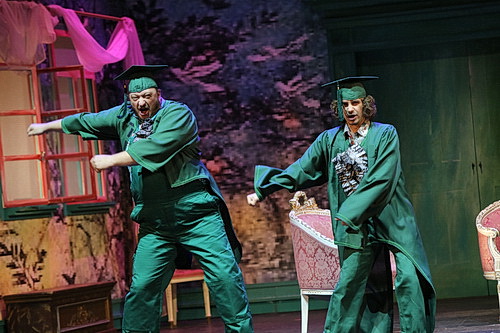 Leisten­schneider bedient zwar durchaus die gängigen Operet­ten­kli­schees, die aber in dieser Insze­nierung einfach herrlich passen und höchste Unter­haltung garan­tieren. Das Bühnenbild von Sabine Lindner zeigt im ersten Bild eine schon fast düstere Außen­szene, die dem Freischütz entliehen sein könnte, dann wandelt sich das Bild, mit wenigen Requi­siten werden die Räume einfach, aber passend darge­stellt. Und die Kostüme von Sven Bindseil wechseln von edler Opulenz bis hin zur lässigen Tracht. Vielseitig und bunt, auf jeden Fall was fürs Auge. Köstlich auch das Duett der beiden Möchtegern-Profes­soren Süffle und Würmchen im frosch­grünen Ornat, hier werden alle Operet­ten­kli­schees im besten Sinne bedient.