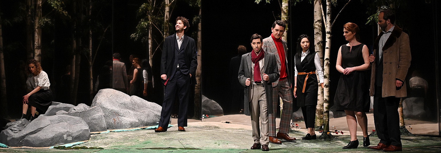 Das Regie-Team interessiert sich sowieso ausschließlich für das, was da auf der Bühne des Theaters Baden-Baden passieren soll. Das Festspielhaus scheint unendlich weit weg. Für Regisseurin Carmen C. Kruse steht die Psychologie im Vordergrund. Es geht ihr weniger um die äußerlichen Abläufe als vielmehr um die inneren Spannungen der Protagonisten. Deshalb hat sie sich gemeinsam mit Bühnen- und Kostümbildnerin Eleni C. Konstantatou und Dramaturgin Rebekka Meyer für eine naturalistische Bühnenlandschaft entschieden. Die Drehbühne unterscheidet sich bei genauerem Hinsehen in drei Landschaften. Da gibt es ein Birkenwäldchen, eine Gesteinslandschaft und einen Sandstrand. Umgeben ist die Bühne teilweise von einer so genannten Spionagefolie, die je nach Lichteinfall für Lichtdurchlässigkeit oder eine spiegelnde Fläche sorgt. Letzteres ist vor allem aus theatralischer Sicht ein mehr als gelungener Einfall – ermöglicht er doch eine Vervielfältigung der Spielorte genauso wie eine erweiterte Kommunikation und Reflektion der Darsteller.