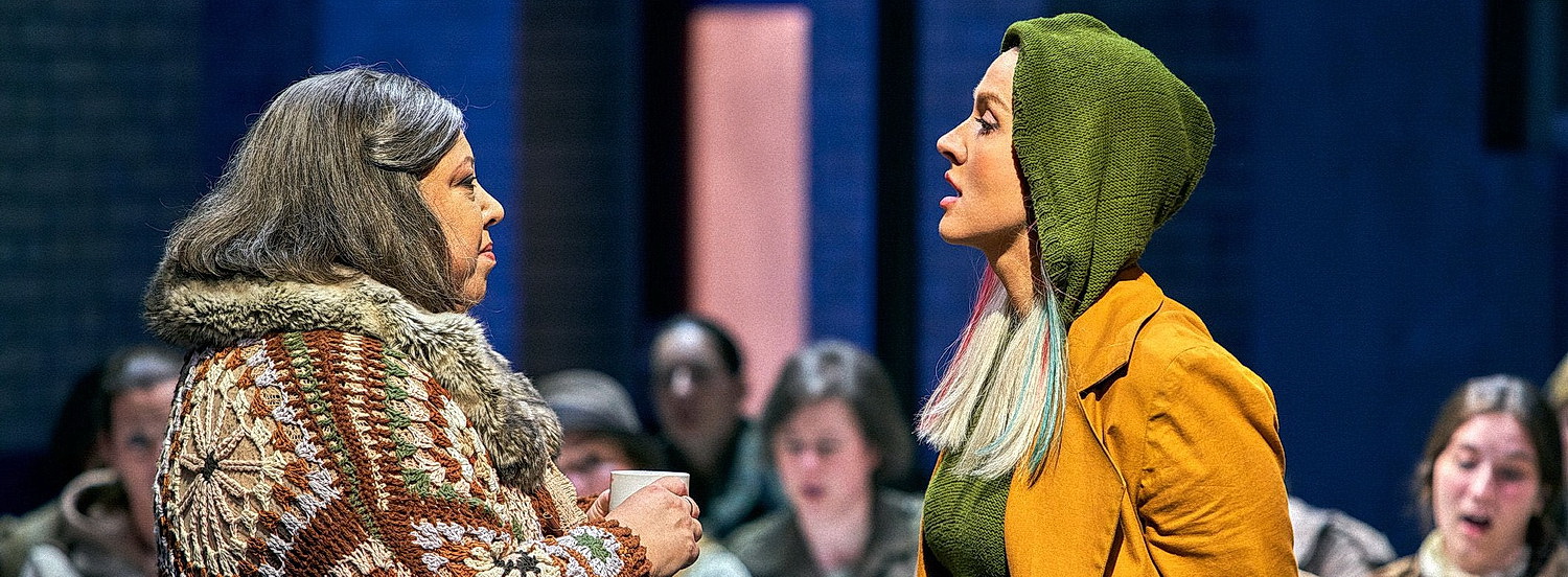 Die eigentlich als Gesänge der Matrosen und der Spinnerinnen benannten Chöre – von Eberhard Friedrich wie immer zuverlässig eingestimmt – sind hier brachial alkoholisierte Typen, die es in jeder Vorstadt-Kneipe geben könnte. Aus der Mitte der Frauen, sittsam als Dorf-Chor um Mary versammelt und von ihr dirigiert, bricht Senta mit Hurra aus. Der Kontrast zwischen Mary, von Nadine Weissmann als altjüngferliche Figur des 19.Jahrhunderts rollengerecht charakterisiert, und der Senta von Elisabeth Teige als Kind der Generation 21. Jahrhundert mit Hoody und knallig gelbem Sommermantel könnte nicht größer sein. Teiges Senta stellt sich mit ihrem erotisch selbstbewusst unterfütterten Sopran dem moralinsauren Muff der Tradition mit revoluzzerhaftem Furor entgegen. Teige zeigt sich als komplette Schauspielsängerin. In weniger als drei Jahren hat sie Bayreuth inzwischen erobert.