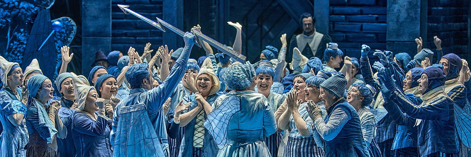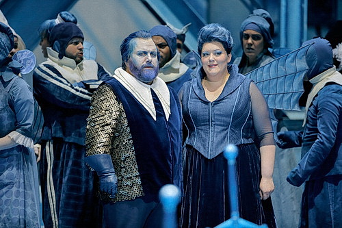 Mit einem Schwert, gestaltet als Blitz-Schwert, fällt Lohengrin dem König Heinrich schick­salhaft in den Arm. Mika Kares singt und spielt einen König, der seine Souve­rä­nität zu verlieren scheint, mit königlich artiku­lie­rendem Bass. Klaus Florian Vogt verkörpert einen Lohengrin, dem man mit der nüchternen Beschreibung Einspringer für den kurzfristig erkrankten Piotr Beczała nur formal gerecht werden kann. Vogts unver­kennbar authen­ti­scher Tenor malt klang­farbig aus einer leise gestimmten Mitte. Als würde eine Fontäne angestellt, sprudeln die Töne erst sanft, gewinnen zunehmend an Strahl­kraft und münden in einen mäandrie­renden Erzähl­strom. Sharons konzep­tio­nelle Lohengrin-Energie findet in diesem Tenor ein breit gefächertes Energie­re­servoir. Kraftvoll betonend Lohen­grins Beharren, namenlos geliebt und als gefei­erter Held akzep­tiert zu werden, lyrisch geschmeidig in seinem Werben um Elsas Einver­ständnis, ihn ohne Namen und Art zu nennen und zu lieben.