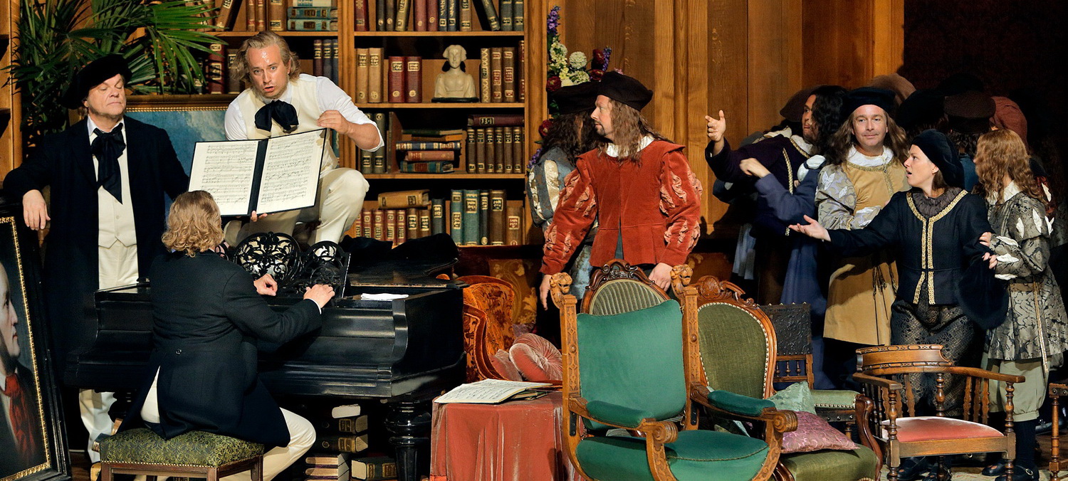 Kaum auszumalen, wie sich die Musiker im Orchestergraben, die Darsteller auf der Bühne fühlen müssen. Denn Klaus Bruns hat wunderbar opulente Kostüme entworfen und in dieser Detailverliebtheit wird man bestimmt gekocht. Für die Zuschauer ist es allerdings ein wahrer Augenschmaus, wie die Meistersinger-Riege in historischen Kostümen und Langhaarperücken aus Wagners Flügel heraus in das Haus Wahnfried steigen. Dort findet eine von Wagners legendären Hausproben statt. Wagner selbst übernimmt dabei die Rolle von Hans Sachs, Hermann Levi wird in die Rolle des Beckmesser genötigt. Logischerweise ist Cosima Wagner das Evchen. Auf diese Art und Weise gelingt Barrie Kosky ein grandioser, verspielter erster Akt und ein mehr als nur interessantes Konzept. Denn mit Hilfe seiner Bühnenbildnerin, der ebenfalls detailverliebten Rebecca Ringst, schlägt er dann noch die Brücke zu den Nationalsozialisten, die Wagners Musik für ihre Zwecke eingesetzt haben: Zu den letzten Tönen des ersten Aktes verschwindet der Saal Wahnfrieds und macht Platz für den Gerichtssaal der Nürnberger Prozesse, wo letztendlich – das ist der dramaturgische Kerngedanke – Richard Wagner vor Gericht steht.