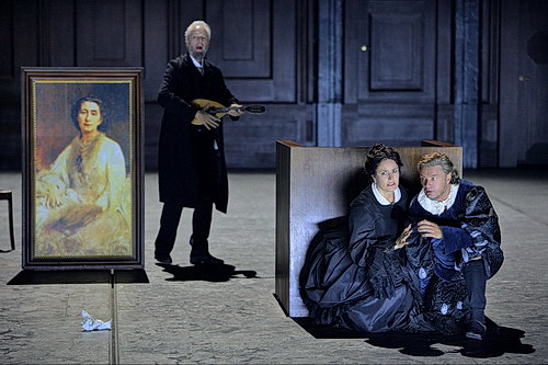 Die Inszenierung imponiert mit ihrer der Komposition adäquaten gesamtkünstlerischen Ensembleleistung von Solisten, Chor, Bühnenbild, mit den minnesängerisch verspielten, von Halskrausen bekrönten Kostümen von Klaus Bruns sowie der Lichtregie von Franck Evin.