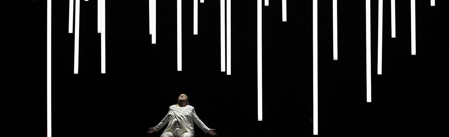 Da es für Schwab im Tristan nichts „Eindeu­tiges“ gibt, bleibt vieles nebulös abstrakt und gibt dem Zuschauer Raum für Assozia­tionen aller Art. Das gilt auch für das Bühnenbild von Piero Vinci­guerra, der mit Schwab bereits in Dortmund Strawinskys The Rake‘s Progress eindrucksvoll in Szene setzte.  Eine arenen­artige Scheibe im Mittel­punkt, überdacht von einer offenen, kreis­för­migen Umrandung, wirkt wie ein Magnet auf die Titel­helden, wirbelnde Video-Einblen­dungen driften sie aber immer wieder ausein­ander. Die Neben­fi­guren müssen sich meist mit der Brüstung des offenen Baldachins begnügen. Figuren, auf die Schwab eigentlich verzichten könnte. Warum sich die Bühne am Ende mit üppigem Grünzeug schmückt und ein altes Statis­tenpaar eng umschlungen an die Rampe tritt, darf jeder Betrachter selbst entschlüsseln.