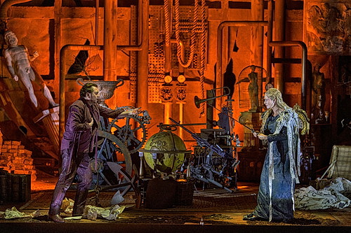 Tragisches Liebesscheitern gibt es auch heute noch. Trotz frequenter, medientechnischer Austauschprogramme. Thorleifur Örn Arnarsson scheint in der von Vytautas Narbuta gebauten Raritäten-Wunderkammer alle Bayreuther Tristan-Inszenierungen versammeln zu wollen, sie gleichsam zu hofieren. Von Wanten und Planken gerahmt, werden ab dem zweiten Akt Reste eines Schiffrumpfs sowie eines offenbar betriebsuntüchtigen Maschinenraums von herabhängenden Tauen gerade noch zusammengehalten. Bilder, Spiegel, Stoffe, antikisierende Torsi, eine Holztruhe, in der Isoldes monumental geheimnisvolles Kleid lagert, sind eher suchend zu identifizieren, als eindeutig zu erkennen.