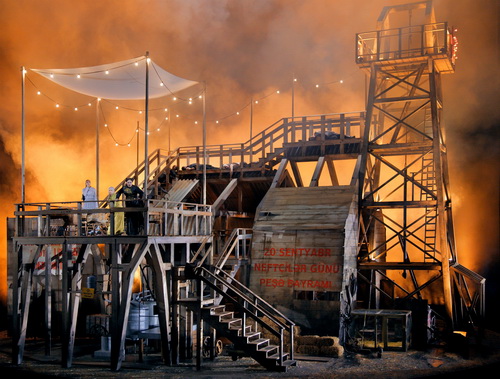 Musikalisch insgesamt also keine Sternstunde. Und über Frank Castorfs umstrittene Inszenierung ist genug diskutiert worden. Von seiner ohnehin spärlichen Personenführung ist so gut wie nichts mehr übriggeblieben, wobei in den überdimensionalen Bühnenbildern von Aleksandar Denić mit ihrer aserbaidschanischen Raffinerie-Landschaft die Figuren ohnehin kaum mit bloßem Auge auszumachen sind.