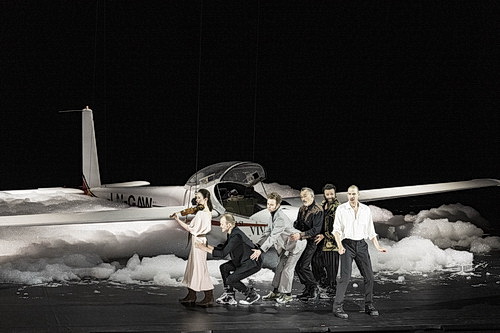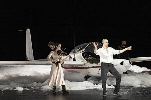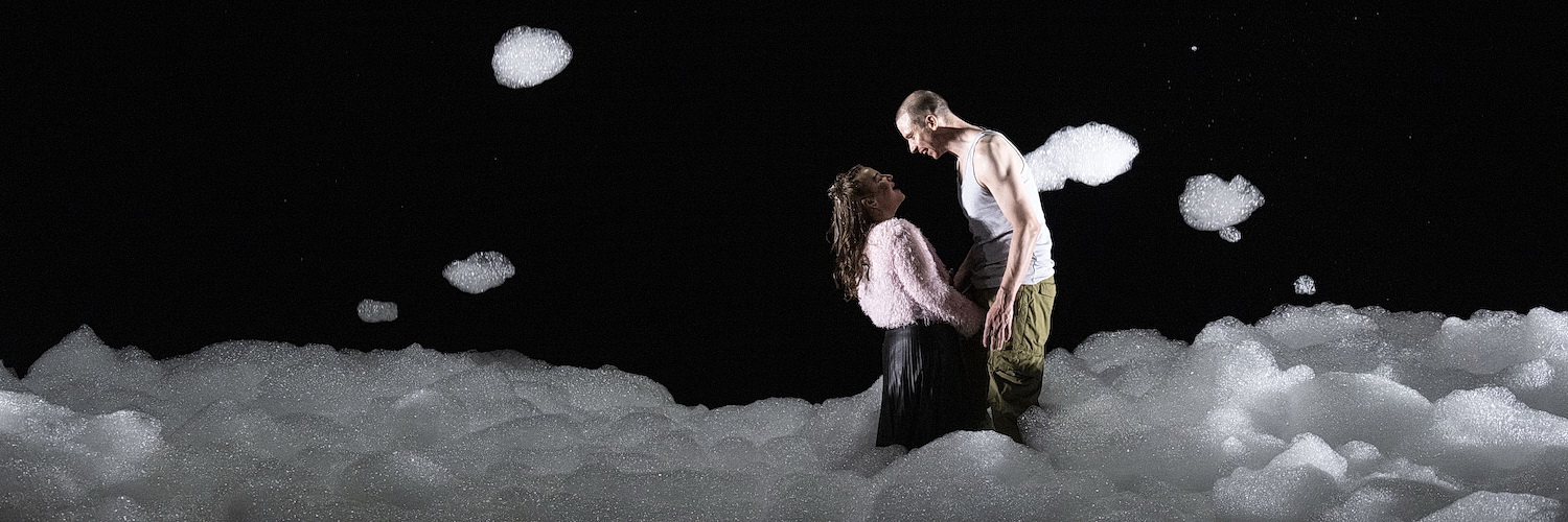 Zur Eröffnung der diesjäh­rigen Festspiele in Bergen hat Johannes Holmen Dahl sich des Meister­werks angenommen. Nia Damerell benutzt die weiträumige, dunkle, leere Bühne der Grieg­hallen und füllt sie im Laufe des Stückes mit nur zwei Requi­siten: ein Gewitter aus vielleicht Seifen­schaum und im zweiten Teil ein echtes kleines Flugzeug, das symbo­lisch für Peers Abenteuer mit ihm einfliegt und auch wieder abfliegt, symbo­lisch für seinen finan­zi­ellen Aufstieg, aber auch seinen Abstieg besonders gut einge­setzt wird. Der kniehohe und nasse Schaum, durch den sich alle Darsteller bewegen, ist auch symbo­lisch für die Nicht­be­stän­digkeit, im wahrsten Sinne „Schaum­schlä­gerei“ von Peers Persön­lichkeit. Regisseur Dahl lässt den Haupt­dar­steller, Herbert Nordrum, seine schlanke, schlaksige Körper­lichkeit voll ausleben. Dieser Peer ist nichts außer wendig, ausdrucksvoll, unglaub­würdig in seinen Ansichten, Fantasien und Plänen – und doch liebenswert. Seine Mutter, Åse, von Ågot Sendstad mit einer beschei­denen und traurigen Selbst­lo­sigkeit darge­stellt, hält resigniert zu ihm bis zu ihrem eigenen ruhigen Tod. Seine Seelen­ver­wandte Solveig, von Frøy Hovland Holtbakk zurück­haltend und hinge­bungsvoll gespielt, setzt ihren wunder­schönen, klaren und lyrischen Sopran ein, besonders mit dem berühmten Solveigs Lied. Sie ist der Gegenpol zu Peers Rastlo­sigkeit und ermög­licht ihm letzt­endlich – in guter protes­tan­ti­scher Tradition – seine seelische Erlösung.