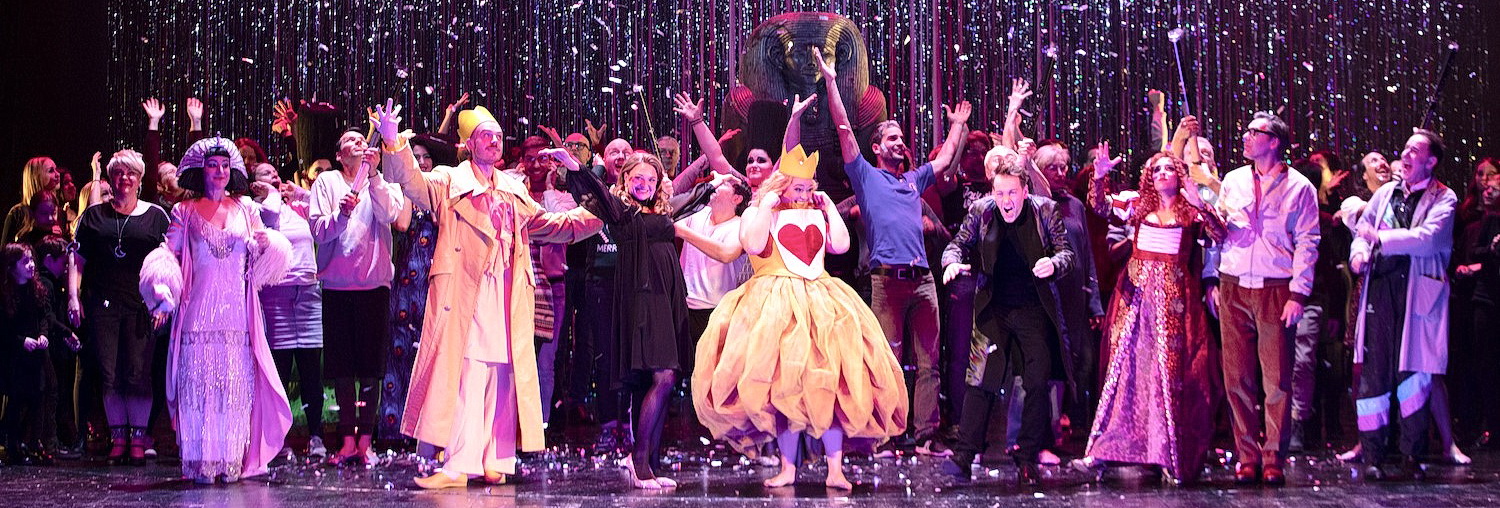 Zuletzt dann doch noch ein Bonbon: Ein kleiner ägypti­scher Flirt aus Die Perlen der Cleopatra mit der einzig­ar­tigen Dagmar Menzel in der Titel­rolle, den Chorso­listen und dem Ballett. Bunt, quietsch­ver­gnügt, frech und überdreht, so wie es das Publikum der Komischen Oper liebt.