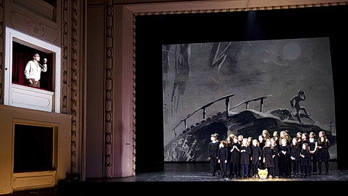 Aber zurück zur Gala:  Zwischen den Video­bei­trägen gibt es live-Einlagen, die alle Ensem­ble­gruppen zur Geltung bringt: Da ist der Chor der Fuchs­kinder aus der Oper Das schlaue Füchslein von Leoš Janáček, das Terzett Soave sia il Vento aus Mozarts Così fan tutte, ein Duett aus Liebe zu drei Orangen von Sergei Prokofjew. Neben den großar­tigen Video­bei­trägen wirken die echten Beiträge fast etwas blass und lassen einige spekta­kuläre Szenen wie das Ballett der Nasen aus der gleich­na­migen Oper von Dmitri Schost­a­ko­witsch vermissen.
