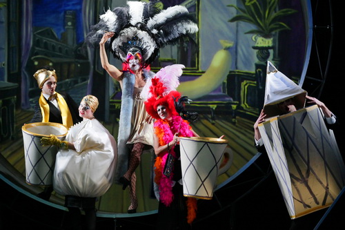 Die Schauspieler des Maxim-Gorki-Theaters sind bisher wenig vertraut mit dem Kabarettgenre. Was man in keinem Moment merkt. Nicht nur, dass alle absolut professionell singen und tanzen, sie beherrschen auch das Metier der Kleinkunst: Es sitzt jede Pointe und jeder Schritt. Vidina Popov und Jonas Dassler verkörpern mit viel Witz das junge Paar, Dassler verblüfft zusätzlich mit einer akrobatischen Nummer. Die anderen schlüpfen in mehrere Rollen und zeigen dabei eine enorme Wandlungsfähigkeit. Svenja Liesau, beispielsweise, als halbseidene Ratten-Else und als kesse Zofe. Oder Catherine Stoyan, die direkt einem Grosz-Gemälde entsprungen zu sein scheint und einen verruchten Tango à la Anita Berber hinlegt. Köstlich auch, wie Oscar Olivo immer mal wieder privat wird und dem Publikum seine Unzufriedenheit mit diesem Engagement anvertraut. Er hat eigentlich keine Lust als Uhr, Bär oder Chausseebaum aufzutreten.