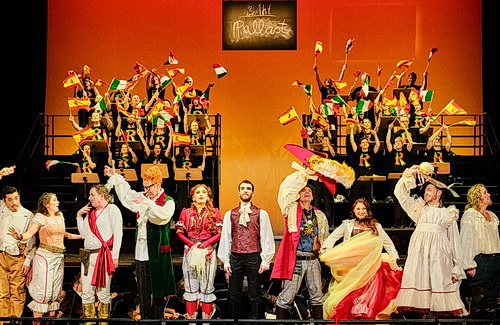 Das Bühnenbild besteht aus zwei Treppen, auf denen der kommentierende Chor sitzt, und einer Vorbühne, die um den Orchestergraben ragt. Regisseur Max Hopp lässt die Charaktere ihre Manierismen übertreiben, um sie lustig zu machen. Das funktioniert nicht. Die aufwändigen und farbenfrohen Kostüme von Katrin Kath-Bösel wirken billig, weil sie die stereotypen Attribute der Figuren zu unterstreichen versuchen – traurig aussehende Rüschen auf einem aristokratischen Hemd, ein übertrieben verzierter Pistolengürtel, mehrlagige Tüllröcke für eine Prinzessin, übermäßig verzierte Samtstoffe für einen Finanzminister, der Regenbogenaufdruck der T‑Shirts der Chormitglieder – und töten so jegliche Feinheiten.