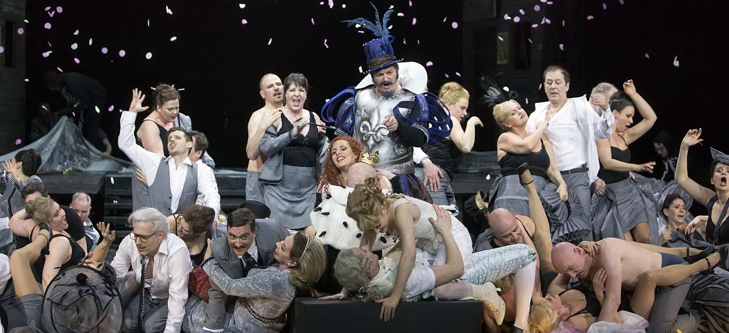 Aus der von Christoph Hetzer entworfenen Wanderbühne purzeln eine Fülle von magischen Kulissen und Requisiten heraus, die jenen Theaterzauber entfalten, der in der Inszenierung nur bedingt aufblitzt. Weil Herheim zu viel will. Er jongliert zwischen vielschichtigem Welttheater, tiefgründigem Diskurs und konventioneller Posse mit vielen anzüglichen Aktionen und neckisch geführtem Chor. Dazu gibt es Verweise auf andere Operetten und auf Felsensteins Inszenierung, die sich in Esther Bialas‘ Kostümzitaten von Blaubart und König Bobèche niederschlagen. Auch die DDR-Vergangenheit und Berliner Aktualitäten kommen zum Zuge, wenn vom Abriss des Palasts der Republik die Rede ist oder das zum Humboldtforum wiedererbaute Schloss als Vorlage für das Bühnenbild des zweiten Akts dient. Solch intellektueller Überbau bekommt dem Blaubart nicht, zumal es am Wichtigsten fehlt: Tempo und pointiertem Timing.