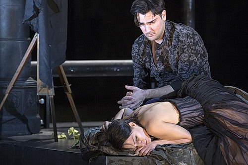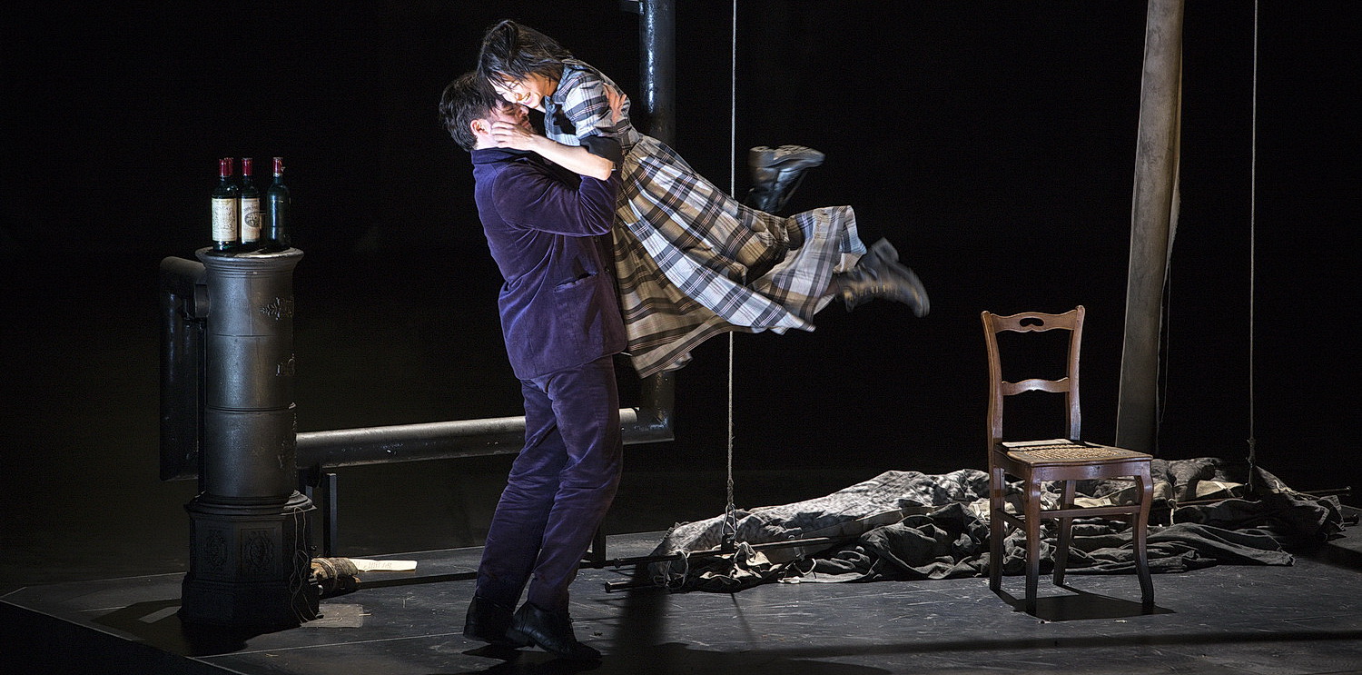 Es sind auch die frühen Daguerreotypien, die das Bühnenbild von Rufus Didwiszus inspirieren, mit Prospekten von verblichenen Porträts und Straßenzügen. So wird dem Konzept des Regisseurs ein Rahmen für die unausweichliche Trostlosigkeit der Beziehung von Rodolfo und Mimì gegeben. Ein kleines, offenes Podest auf der Bühne stellt die wohngemeinschaftliche Mansarde dar, die die vier Lebenskünstler vermutlich teilen. Der von finanzieller Not geprägte Alltag wird in der Café-Momus-Szene allerdings auf den Kopf gestellt. Immerhin ist es Weihnachten, und die Menschenmenge feiert ausgelassen. Der Zuschauer weiß gar nicht, wo er zuerst hinsehen soll, und viele Details gehen unter – der einzige Eindruck, der bleibt, ist eine überbordende Burlesque, mit einem Parpignol, der eine Fantasiemischung aus bayerischem Wolpertinger und Clown ist, Nonnen, Nutten, schwarz gekleideten Pierrot-Kindern und vielem mehr.