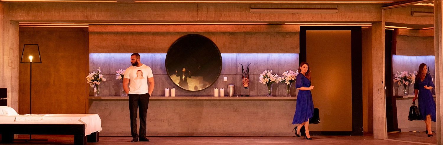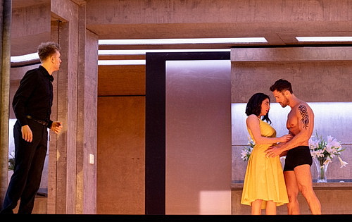 Kirill Serebrennikov geht gar nicht auf die übliche Maskierungscharade ein. Der Abschied der beiden jungen Männer, die überraschend ins Militär einberufen werden, von ihren Verlobten Fiordiligi und Dorabella beweint und mit Kriegsvideos bebildert, wie wir sie aktuell jeden Tag in den Nachrichten sehen. Die Abschiedstrauer ist noch nicht vorüber, da erhalten die in modische schwarze Kleider gewandeten Trauernden auch schon die Urnen mit der vermeintlichen irdischen Asche ihrer Liebsten inklusive blumigen Heldenschmucks. Kein Wunder, wenn die Vertraute Despina – mit einer angezeigten digitalen Zahlung von 20.000 Euro von Don Alfonso schon auf ihrem PayPal-Konto – den beiden Trauernden zwei muskelbepackte, tätowierte Jungs anpreist. Diese stummen Rollen – von Goran Jurenec und Amer El-Erwadi äußerst realitätsnah verkörpert – geben dem Ganzen eine raffinierte Erotik. Das erhöht die Spannung und macht auch aus dem Zuschauer einen Voyeur, während Ferrando und Guglielmo als Avatare ihrer selbst ihre eigenen Verführungskünste besingen. Die zwei Ebenen verwandeln sich in Boutiquen, in denen die Mädels shoppen gehen, dann in designergestylte Wohnungen – mal die integrierte Küche samt Espressomaschine, mal minimalistisch eingerichtetes Schlafzimmer. Kirill Serebrennikov zeichnet für Regie, Bühnenbild und Kostüme verantwortlich.