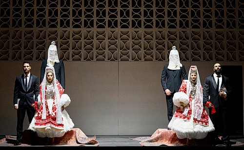 Die Schlussszene der Così ist immer eine Herausforderung für den Regisseur – wie geht es aus, wie verhalten sich Fiordiligi und Dorabella, wenn ihre ursprünglichen Verlobten zurückkehren? Serebrennikov ist konsequent bei seinen Doppeldeutungen: Die Hochzeit mit den Fremden wird als Albtraum dargestellt mit einer kurzen musikalischen Einlage der Höllenfahrt aus Don Giovanni, komplett mit Stroboskoplicht, schwarzen Bären mit Hörnern – in Bayern würde man sie als Wolpertinger bezeichnen – die Bräute in fantasievollen, traditionellen albanischen Hochzeitsgewändern. Wenn der Hokuspokus endet, sitzen beide Paare entfremdet auf dem Boden. Ausgang ungewiss. Don Alfonso sprayt Così fan tutte als Grafitto auf die Hinterwand. Streicht das tutte aus und macht daraus tutti – so machen es alle und nicht nur die Frauen.