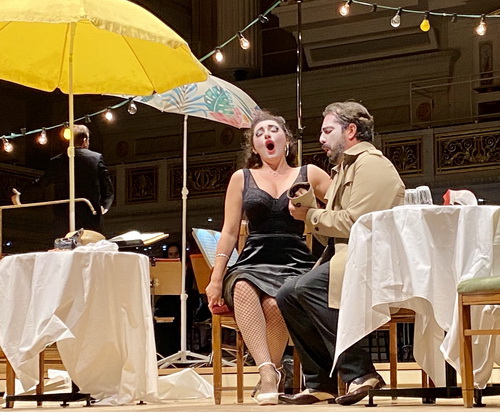 Dieser knapp 60 Minuten langen, einaktigen Oper hat sich Regisseur Lorenzo Fioroni angenommen. Mit Sonnenschirmen, einigen Tischen und Stühlen hat Katharina Gault eine sonnige Osteria auf die Vorderbühne gezaubert. Hier spielen sich die Szenen dieser Slapstick-Komödie ab. Fioroni lässt die drei Sänger ihre Charaktere übertreiben, wie es sich für das Genre gehört. Nichts ist subtil hier, alle Andeutungen werden herausgestellt.