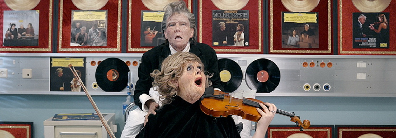 Regisseur Martin Miotk meint, die Seele kann in der Musik gefunden werden. Er lässt die Bühne des Alten Delphi-Theaters als nachempfundenes Konzerthaus Berlin erstrahlen. Nina Schopka ist das vieldeutige KI-Wesen Ursula, das in den Körper Karajans schlüpft und Martha Ärgerlich peinigt, auf dem Klavier Perfektion zu finden. Alba Gentili-Tedeschi macht das vorzüglich und gibt der berühmten Pianistin ihr ganz eigenes Leben, aber nicht ihre Seele her. Karajan, also Ursula, nimmt sich als nächstes eine Opernsängerin vor. Gina May Walter ist die Synthese aller Operndiven – bildschön, elegant, mit ihrem ganz eigenen vokalen Charisma, wenn sie Casta Diva aus der Oper Norma singt, aber auch sie gibt ihre Seele nicht weg. Also begibt sich Ursula in Karajan-Gestalt in das Altenheim Happy End, wo er seine ureigene Erfindung trifft, die Geigenvirtuosin Anne-Sophie Mutter. Die ist mittlerweile fast dement, klammert sich an ihre Geige, als wäre es ihr Baby, aber auch sie gibt nichts her.