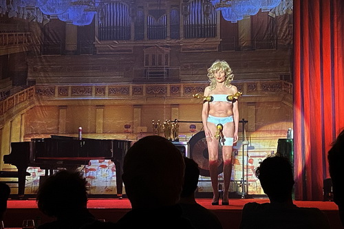 Erst als Arzt Ursula ihr droht, springt, oh, Michelangelo-Kreationswunder, durch eine leichte Berührung vielleicht doch ein Seelenfunken überspringen. Frankenstein lässt grüßen. Nun kann Ursula alle Preise gewinnen – Emmys, Grammys, Echos, Oscars – die sie aus der Geschirrspülmaschine holt. Sie ist an ihrem Artmatrix-Gipfel vollkommen angekommen und ist besonders anmutig anzuschauen in ihrem Outfit, bestehend aus einem Bikini mit zwei Oscarfigurinen am Oberteil 3‑D-mäßig hängend und einer Figurine als Dildo. Jetzt kann sie ihre elendlange und sich adjektiv-wiederholende Rede halten. Ganz im Sinne von ChatGPT hängt sie sekundenlang immer wieder, während die passende marketingreife Formulierung in der KI-Datenbank zusammengebastelt wird. Womit aber die KI nicht gerechnet hat, der Seelenfunkensprung hat auch die Demenz übertragen, und somit erledigt sich die schöne,neue Welt. Als Epilog der etwa 90 Minuten dauernden Show erscheinen noch zwei Gestalten in weißen Kitteln, die sich als die Programmiereltern von Ursula entpuppen und zugeben, es sei alles nur ein Experiment gewesen, das sich verselbständigt habe.
