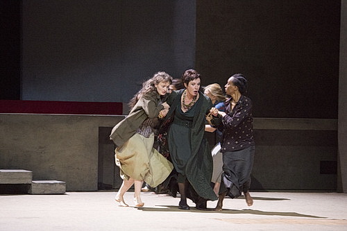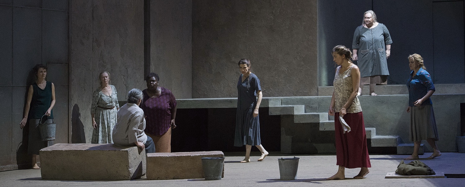 Die Szenerie ein düsterer, gefängnisartiger Unort, bevölkert von gehässig keifenden, wasserschöpfenden Mägden. Unter ihnen, sich in die hinteren Hofwinkel versteckend, die von ihrer vatermordenden Mutter Klytämnestra gedemütigte Elektra.