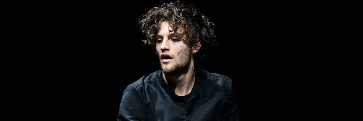 So wild die physische Ebene vorgeführt wird, so sanft geht es auf der musikalischen Ebene zu. Ted Schmitz trägt melancholische Songs vor und begleitet sich selbst auf der Gitarre, Tobias Weber auf der E‑Gitarre und Percussionist Philipp Kullen spielt mit eher sanften, monochromatischen und minimalistischen Tönen, die gut tun, ganz im Kontrast zu den überdrehten Beiträgen der drei Darstellern des dritten Jahrgangs der Otto-Falckenberg-Schule München, die auf der Bühne agieren.