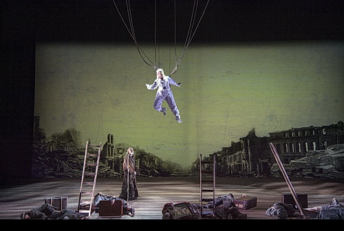Neben Merlin spielen die allfäl­ligen Protago­nisten verschiedene weitere Rollen. Puppen ergänzen zusätzlich das Personal von Spielern und Sängern mit symbo­lisch aufge­la­denem Gestus. Die britan­nisch konno­tierten Zeitebenen wechseln zwischen der Purcell-Zeit, der des Zweiten Weltkriegs und der Gegenwart, ohne dass sie unmit­telbar getrennt bestimmt sind.