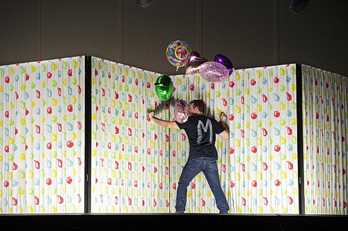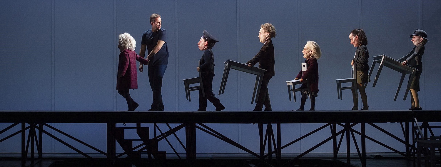 Das Bühnenbild von Klaus Grünberg, das über einem beweg­lichen Podest aus Stangen befestigt ist, zeigt abwech­selnd eine Häuser­front, das Innere eines Polizei­re­viers und eine gekachelte Badezeile mit etlichen Türen. M tritt als einziger in heutiger Alltags­kleidung auf, in Jeans und T‑Shirt. Auf seinem Rücken prangt das ihn als Mörder stigma­ti­sie­rende M. Scott Hendricks bemüht sich, ihm gestal­te­rische Kontur zu geben, singt mit markantem Bariton und bleibt doch insgesamt blass und eindi­men­sional. Alle weiteren Rollen werden von Kindern verkörpert. Sie sind allge­gen­wärtig, spielend, rezitierend und singend – die von Dagmar Fiebach einstu­dierten Chorpas­sagen machen großen Eindruck. Doch der szenische Clou ist, dass auch die Erwach­senen von Mädchen und Jungen verkörpert werden. Sie bilden ein groteskes Panop­tikum im Stil der Zwanziger Jahre mit übergroßen Köpfen aus Pappmaché – ein Meister­stück des Masken­bildners Tobias Barthel.