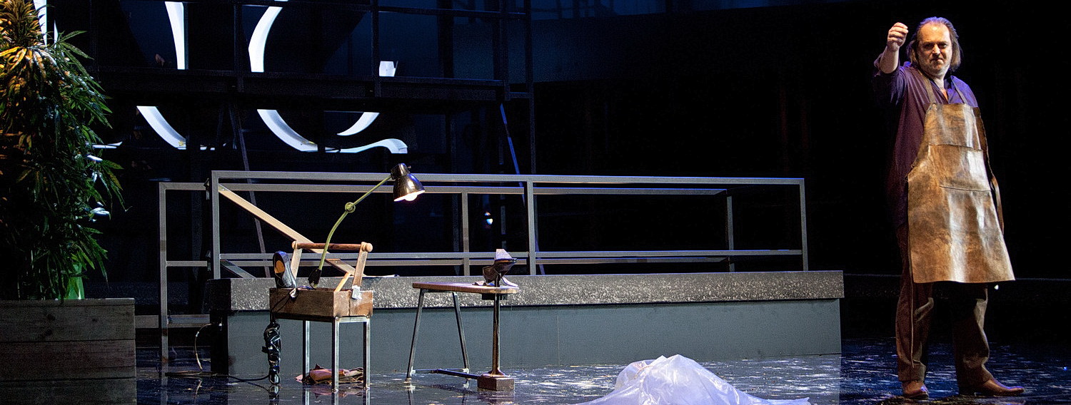 Unter einer „Komödie von leichter Hand, ein heiter-humoristisches Satyrspiel” versteht man heute sicherlich etwas anderes, als Richard Wagner, der ab 1862 sein Werk Die Meistersinger von Nürnberg komponierte. Zumal die Inszenierung von Andrea Moses in dieser Produktion – ursprüngliche Premiere am 3. Oktober 2015 – doch sehr auf Schwarzrotgold und Fahnenschwingen setzt. Jan Pappelbaum hat einen Kirchenraum entworfen, welcher sich im Handumdrehen in einen Chef-Konferenzraum für das Treffen der Meister umwandeln lässt.