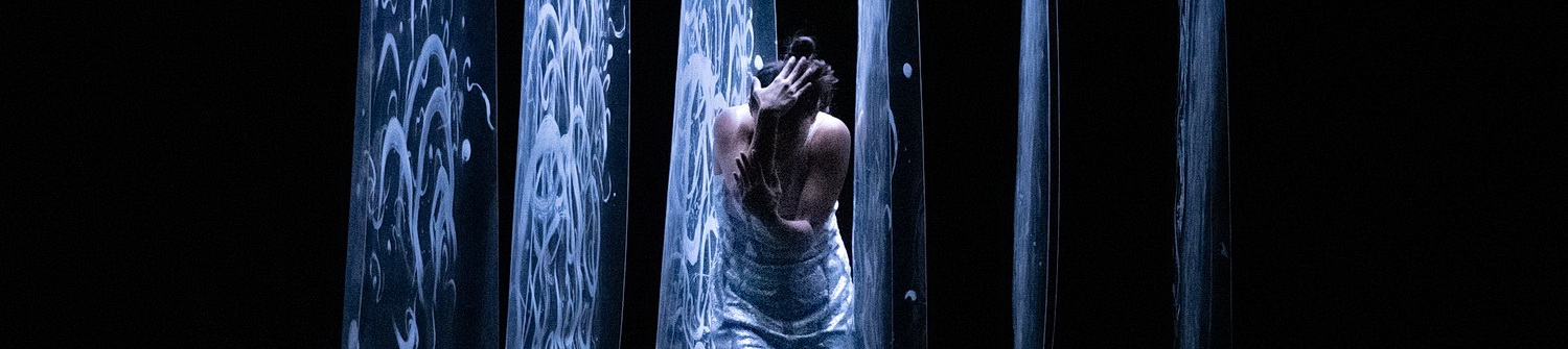 Die verdun­kelte Bühne wird nur von diffusen Licht­blöcken erhellt – niemals verlässt die Tänzerin diese Zwischenwelt, begibt sich weder in tiefe Nacht noch gleißenden Tag. Nur eine Instal­lation von sechs bemalten Acryl­hängern von Acci Baba deuten Lebens- oder Traum­phasen an, sind Anreiz und Hindernis zugleich. Joy Alpuerto Ritter begibt sich zwischen und unter die Hänger, umwirbt sie, umspielt, prallt ab – es sind letzt­endlich die Fäden und Schichten der Puppe, die dem Schmet­terling zu neuem Leben verhelfen werden.