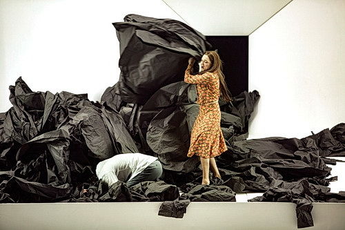 Das abstrakte minimalistische Bühnenbild von Paolo Fantin verwandelt sich oft dank eines schwebenden Kubus‘, der immer wieder einen neuen Innenraum, eine Herzkammer freigibt: Hier finden die innigsten Emotionsausbrüche statt, hier stirbt Euridice, aber wird durch einen Schwall Wasser auch wieder zum Leben erweckt. Anderseits verwandelt sich der Raum in einen perspektivischen Trichter, der zur Unterwelt führt und durch den sich Orfeo mit gefühlten tausenden von Metern schwarzen Materials durchwühlen muss, nachdem er die Furien besänftigt hat. Dank der sehr gelungen Lichtdramaturgie von Alessandro Carletti bekommen die diversen Szenen und Ebenen der Ober- und Unterwelt zusätzliche pastellfarbige Dimensionen, deren psychologische Bedeutung allerdings nicht auf Anhieb erklärbar ist. Klaus Bruns besorgt die zeitlosen, banalen Kostüme der Protagonisten – Orfeo und Euridice sind wie du und ich gekleidet. Choreograf Thomas Wilhelm gibt den Furien als Einheit ein ganz eigenes Leben, ebenso wie er eine witzige Balletteinlage im dritten Akt zaubert, wo verdreifachte Schatten von Euridice immer wieder entschwinden, sehr zur Erschütterung Orfeos.