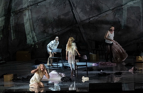 Die Regisseurin beschwört in ihrer Inszenierung eine verdorbene Welt, die aus den Fugen geraten ist. Das Bühnenbild von Barbara Hanicka stellt eine offene, zeitweilig rotierende Halbkugel in meist düsteren Farben dar. Projektionen suggerieren Natur- und Klimakatastrophen und eine Atomexplosion als Horrorszenarium. Die Erde könnte es sein, ein Bunker oder ein Kopf. Einmal flattern schwarze Vögel wie in Hitchcocks Thriller vom Himmel und natürlich ist auch Corona präsent, wenn sich die Mitwirkenden Masken aufsetzen, in Anspielung auf eine Textpassage, in der von einem Virus die Rede ist.