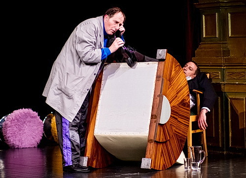 Treu dem Namen der Insti­tution – Komische Oper Berlin – wurden zwei Musicals hinter­ein­ander heraus­ge­bracht. Erst La Cage aux Folles in einer sehr üppigen Produktion, jetzt Die Rache der Fledermaus in einer minima­lis­ti­schen Ausstattung. Die Frage kommt ganz natürlich – wie teilt man am besten ein Budget auf? Den Besucher freut beides, und hier wie dort werden die Produk­tionen wild gefeiert.