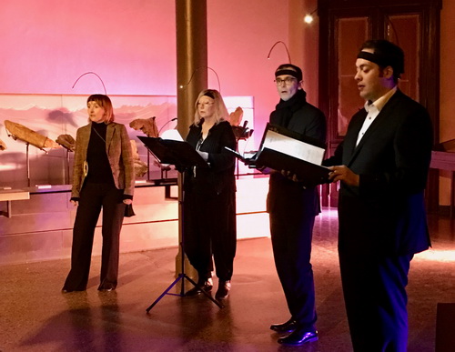 Als zusätzliche Komponente schrieb Mark Ravenhill ein Libretto für ein Vokalquartett. Sopran Christina Andersson, Alto Regina Jakobi, Tenor Lee Steiner und Bass Jonas Böhm drücken diese dichterisch-philosophischen Wahrnehmungen über die diametral gegensätzlichen Lebenswandlungen von Mensch und Oktopus in zehn Sprech-Gesängen aus. Zentrale Figur der Dichtungen in unterschiedlichen Genres ist der Oktopus Vampyrotheuthis infernalis, der, trotz seines furchterregenden Namens, gerade mal zehn Millimeter groß ist und über den der Philosoph Vilém Flusser ein Essay über das Welterleben des Vampirtintenfisches schrieb. Es wäre hilfreich gewesen, wenn das Libretto vorab erhältlich gewesen wäre. So können nur einzelne Phrasen und Worte verstanden werden. Das Vokalquartett tritt erst als Gemeinschaft auf, dann gehen die vier Sänger einzeln in das umherstehende Publikum und sprechen, wiederholen den Text von Ravenhill.