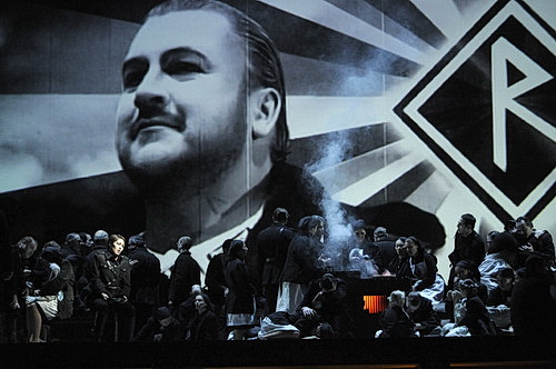 Somit ist die Handlung reduziert auf den Aufstieg und Fall des Volks­tri­bunen Rienzi. Die parallele Handlung, die Liebes­ge­schichte zwischen Adriano und Irene, Rienzis Schwester, gerät hier zu einem unbedeu­tenden Neben­schau­platz. Auch die tiefen­psy­cho­lo­gische Dreier­be­ziehung zwischen Rienzi, Irene und Adriano wird nicht beleuchtet. Statt­dessen arbeitet Stölzl, der auch für den Bühnen­aufbau verant­wortlich ist, mit platten Effekten. Die blonde Irene im hellen Dirndl und Gretel­kranz im Haar entspricht dem arischen Menschenbild des Natio­nal­so­zia­lismus und könnte auch eine Anspielung auf Eva Braun sein, während Adriano in schwarzer Uniform natürlich auch optisch den Kontrast zu den weißge­klei­deten unifor­mierten Gefolgs­leuten Rienzis bildet.