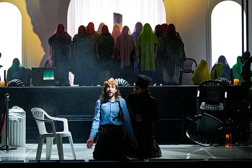 Bereits die ersten Auftritte der Solisten machen überdeutlich, dass die Zweitbühne die Künstler in ihrer Bewegungsfreiheit behindert und zu starrem Rampensingen verdonnert. Dasselbe gilt für den Chor, der im Verlauf der fast dreistündigen Oper noch so manchen kunterbunten Kostümwechsel erleben wird. Kostümbildnerin Jelena Miletić mangelt es nicht an Fantasie, was manchmal für kuriose Momente sorgt. Beispielsweise dann, wenn die Damen und Herren aus ihrer Toga ein Tuch hervorzücken und beim Forte freudig damit wedeln. Die Bühnen Bern sind eins der wenigen Häuser, die dem Chor noch Hygienemasken auferlegen und auch hier entfaltet sich unfreiwillig komisches Potenzial, wenn der Solist die Stoffbahn für seinen Einsatz kurz unters Kinn zieht.
