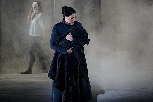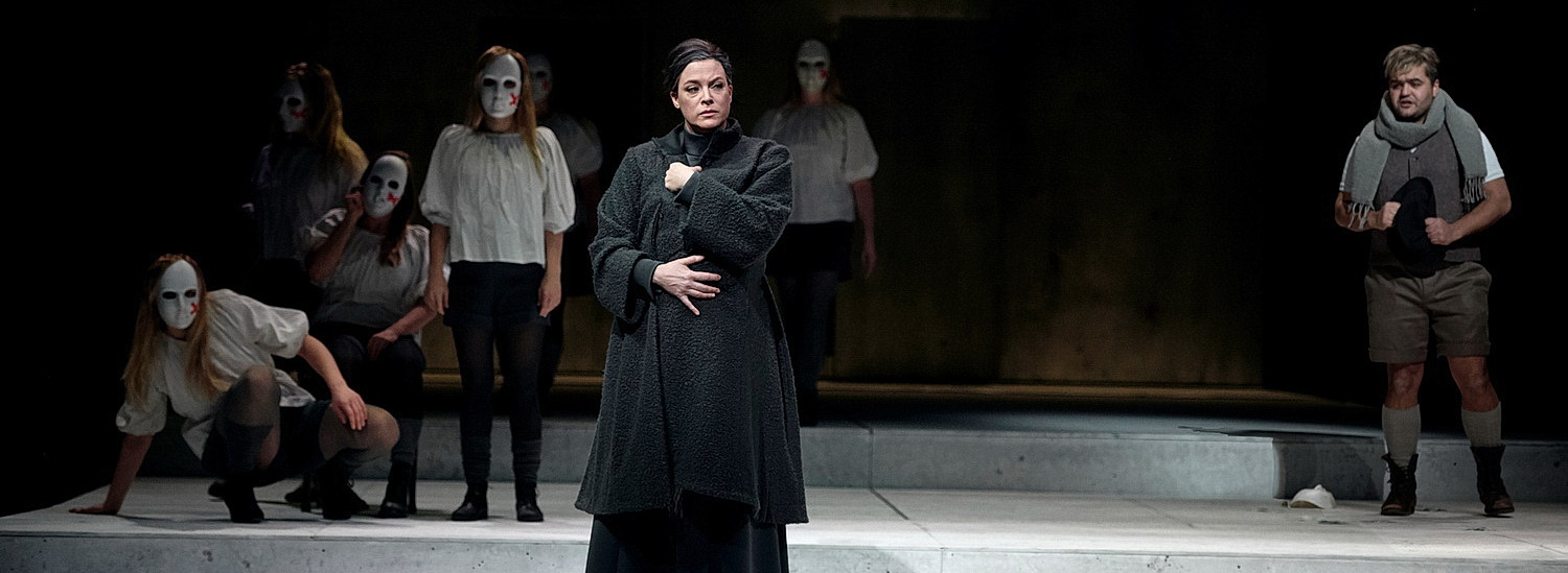 Die rurale Gemeinschaft, in der das Drama um Liebe, Zurückweisung und Verrat seinen unheilvollen Lauf nimmt, ist in der entrümpelten, kühlen Lesart kein mährisches Dorf um 1900, sondern lediglich ein Echo einer vergangenen Zeit. Die Thematik um eine Kindstötung könnte sich genauso gut im Hier und Jetzt abspielen. Höckmayr präsentiert eine schlüssige Personenführung, die sich noch dadurch verstärkt, dass einzig die Figuren agieren, die etwas zu sagen respektive zu singen haben. Maskenbefreit notabene. Die anderen Gestalten verharren mit ihrer Larve im Freeze in einer Art Schockstarre – den schaurigen Lauf der Dinge vorausahnend. Nichts sehen, nichts hören, nichts sagen. Die Sitten und Gebräuche dieser eingeschworenen Eintracht mit ihren lebensfeindlichen Zwängen sind evident. Christian Aufderstroth am Licht schafft dazu die passende Stimmung, in dem er den Raum selten verdunkelt, sondern die Akteure ausleuchtet und somit auch bloßstellt.