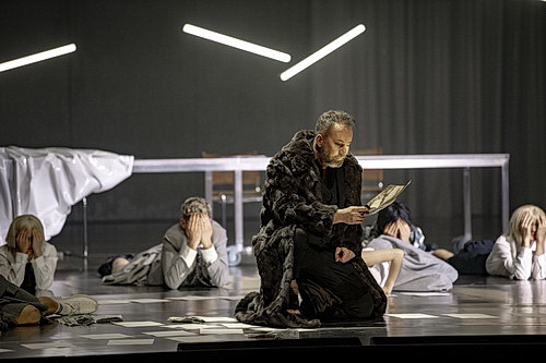 Grell leuchtende Neonröhren erhellen Alberichs Reich, hier wird zumindest evident, dass der Kapitalismus eine kalte Angelegenheit ist. Der Unterdrücker ist ein Military-Man, der sich zuerst in Springerstiefeln Gold und Ring erschleicht und danach mit knielangem Pelzmantel den Platzhirsch zelebriert. Der Fingerzeig aufs böse Patriarchat ist gar plakativ. Alberichs Eleven funktionieren nämlich wie Roboter und hecheln unter dem Bürotisch wie dressierte Hündchen. Warum sich neben den Mädchen auch die Buben im sittsamen College-Röckchen pantomimisch verrenken, erschließt sich wiederum nicht. Geht es um Genderidentität? Das Hantieren mit den federleichten Goldballen hat etwas von einer Schülervorstellung, auch für Schloss Walhall kommt eine zerknitterte Alufolie zum Einsatz und man wähnt sich in diesem Schlussbild in der Märchenstunde.