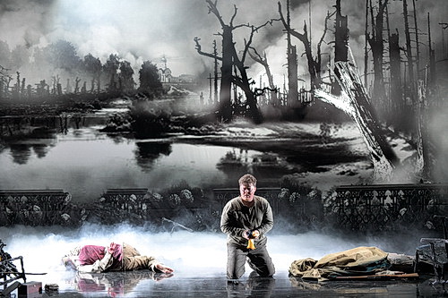 Dieter Kaegi hat schon mit seiner Anschauung von Bartóks Blaubart, in der er die Entführung von Natasha Kampusch thematisiert, dargelegt, dass er sein Publikum nicht schont. So ist es auch bei Mazeppa mit der Ausstattung von Dirk Hofacker. Seine Regie zeigt Krieg und Folter gnadenlos auf, den Soundtrack dazu liefert ihm der russische Komponist. Am Anfang ist das Laufen über glühende Kohlen noch ein Spiel, doch es wird zur bitteren Realität. Die Szene im Folterkeller, wo Orlik Marias Vater eine Nacht der Schmerzen bereitet, ist nichts für schwache Nerven. Und wo einst ein Birkenhain stand, sieht man im letzten dritten Akt nur noch verbrannte Erde und flüchtende Menschen. Mario Bösemann am Licht schafft beklemmende Momente. Die Geschichte ist in den 1950-er Jahren angesiedelt, während der Zeit des Kalten Krieges, und der Konflikt zwischen Russland und der Ukraine dauert bis heute an.