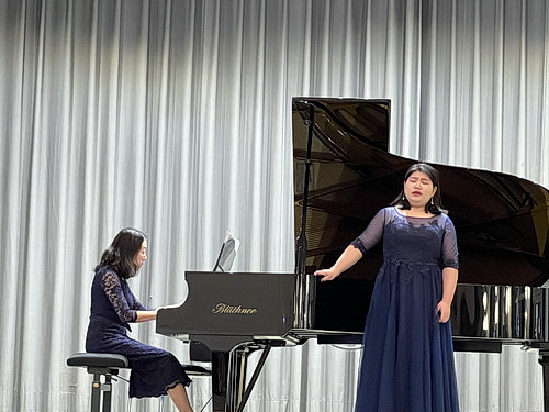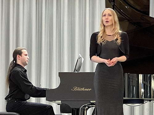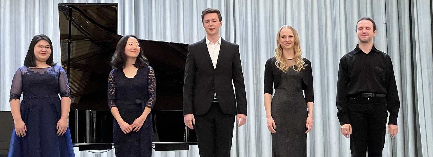 Die erste große Überraschung ist der Programmzettel, der auf den Stühlen ausliegt, denn in der Ankündigung des Konzertes war außer dem Programmtitel nichts über den Inhalt zu erfahren. Es ist ein äußerst ambitioniertes Programm, das sich die Studenten da vorgenommen haben. Der Hauptteil des Konzertes ist der Liederzyklus Myrthen, op. 25, von Robert Schumann, der von der Sopranistin Mechtild Söffler und dem Bariton Lorenz Schober vorgetragen wird, begleitet von Dmitrii Zhovkovskii am Blüthner-Flügel. Der Zyklus besteht aus 26 einzelnen Liedern und wird bei diesem Konzert in zwei Teilen dargeboten. Erweckt diese Programmankündigung die Neugier und Vorfreude, versetzt der zweite Teil den geneigten Zuhörer in Erstaunen. Richard Wagners Wesendonck-Lieder als musikalisches Intermezzo zwischen den beiden Myrthen-Teilen. Dieser kleine Zyklus von 5 Liedern, die normalerweise mit Orchesterbegleitung dargeboten werden, erklingt hier von der Sopranistin Xinxin Zhao, am Flügel begleitet von Jieun Baek. Diesem Opus widmen sich meist erfahrene Wagner-Interpreten, denn neben einer ausgereiften Gesangstechnik kommt es, wie auch bei allen anderen Liedern, auf den Ausdruck an. Große Sängerinnen haben diese Lieder verewigt, allen voran die unvergessene Jessy Norman. Ganz aktuell gibt es eine berührende Neueinspielung, live von den Salzburger Festspielen 2020 mit Elīna Garanča und den Wiener Philharmonikern unter Christian Thielemann. Sich als Studentin an einen derartigen Zyklus zu wagen, erfordert viel Mut und Selbstvertrauen, verbunden mit einem nicht unerheblichen Risiko, dass die Darbietung „in die Hose gehen kann“. Doch der Reihe nach.