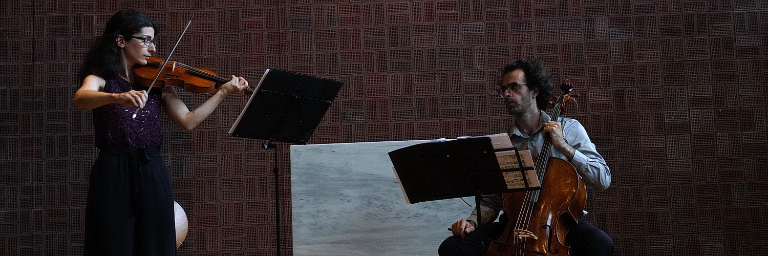 Will man das hören? Ja. Man will. Man muss. Weil es eine großartige musikalische Erfahrung ist. Der Veranstaltungsort versteht sich als Dialograum für christlichen Kult und zeitgenössische Kultur. Ein Blick auf das Programm eröffnet ganz neue Perspektiven. Von außen wirkt er eher wie ein Bunker. Eine Treppe führt hinauf zum Saal, der an einen ausgesegneten Kirchenraum erinnert. An der Backsteinwand im Hintergrund erinnern dunkle Schatten daran, dass hier mal irgendetwas gehangen haben muss. Auf einem Holzpodium in der Mitte des Saals ist ein Altarstein zurückgeblieben. Davor stellen sich die Musiker auf. Auf der linken Seite gibt es eine Empore, an deren Rückwand der Triebriemen einer Glocke zu sehen ist, die pünktlich um 18 Uhr in Betrieb geht. Auf der rechten Seite erlauben Oberlichter den Einwurf natürlichen Lichts, das zusätzlich von Scheinwerfern und Deckenbeleuchtung unterstützt wird. Die Akustik ist ausgesprochen angenehm. Hier kann man sich als Streicherduo richtig wohlfühlen.