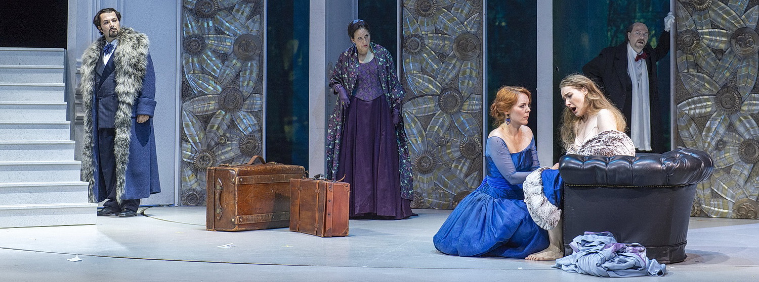 Hofmannsthal siedelt die Handlung konkret um 1860 im Wien der Gründerzeit an. Für die Bonner Produktion hat Marelli, der auch für das Bühnenbild und die Licht­regie verant­wortlich zeichnet, dem Sujet die Plüsch- und Kitsch­ele­mente weitgehend entzogen. Hofmannsthals Salon in einem Wiener Stadt­hotel ist jetzt ein nüchterner dekor­freier Raum mit hohen, drehbaren Türen. Hofmannsthals Treppenhaus, aus dem die Stiege im Hinter­grund in zwei Wendungen nach oben führt, ist eine rein funktio­nelle Angele­genheit. Kaum zu verstehen, dass Strauss dem Stiegenhaus ein eigenes Thema schenkt. Möbliert ist die Szene kaum. Unüber­sehbar im ersten Akt die Reise­koffer, aus denen die Protago­nisten zu leben scheinen. Ein Symbol für die Vergäng­lichkeit? Für die Abschieds­stimmung, die immer wieder in Text und Partitur durch­scheint? Ein Rekurs auf die Entwur­zelung, die Menschen auch im 21. Jahrhundert erleben müssen?