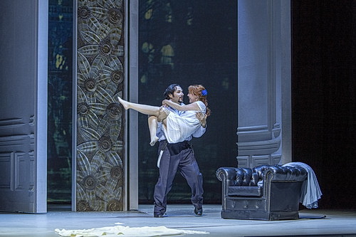 Ganz Gegenpol zum Zeitgeist, ganz auf der Höhe seiner Idee von Regie­theater legt Marelli großen Wert auf eine einfühlsame Perso­nen­regie, die von einer stimmungs­vollen Licht­regie – klug illumi­nierte Umschwünge in Handlung und musika­li­scher Begleitung – ergänzt wird. Große Gefühle gibt es bei ihm im Knien. Mandryka kniet, als er Arabella in den Schuh verhilft, die Hand der Tochter des Grafen Waldner auf der Schulter. Arabella kniet am Ende, jetzt die Hand des Bären­jägers auf ihrer Schulter. Beide knien, überwältigt von der Utopie des gleich­ran­gigen Mitein­anders. Und wo ich Herr bin, wirst du Herrin sein und wirst gebieten, wo ich der Gebieter bin, wie es Mandryka ausdrückt. Der beste Kommentar im Übrigen wider jene ideolo­gische Auffassung, die Hofmannsthals Arabella darin verfangen sehen will, nur untertan zu sein.