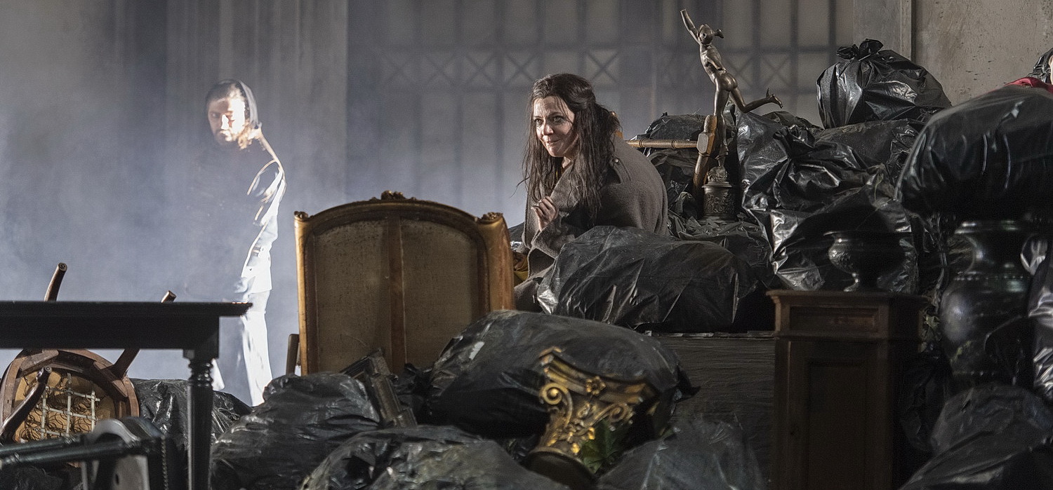 Das beeindruckende Bühnenbild gibt die Richtung vor. Antikes Ambiente ist nicht mehr angesagt. Elektrisches Licht, ein Lüster, ein Trichtergrammophon und die großfeudale Innenarchitektur lassen an die 1930-er Jahre denken, in die das Spektakel verlegt worden ist. Das Geschehen spielt sich weitgehend unter prekären ästhetischen Bedingungen vor einer repräsentativen Freitreppe hinauf zum Königspalast von Mykene auf Müllbergen im Kellergeschoss ab. Bis heran an den Orchestergraben stapeln sich grauschwarze Säcke, in die alles entsorgt wird, was am Hofe der Prasser so ausgespuckt wird. Jede Menge Vergangenheit, die woanders unter dem Teppich landen würde. Unbearbeitetes, das dazu beiträgt, die Familienkonflikte am Schwelen zu halten. Dazu Tand, Küchenschrott, ausrangierte Kleidung in Mengen, in der Elektra nach dem Beil sucht, das in den Händen Orests seine Bestimmung finden soll. Auch der Leichnam der aufsässigen Magd, die gegen die Schande auf dem Thron aufbegehrt. „Hingucker“ sind die fünf Mägde im schick geschneiderten Einheitslederkostüm, die ziemlich damit beschäftigt sind, immer neue Müllsäcke zu deponieren und durch Räumaktionismus eine Ordnung zu simulieren, die ohnehin nicht angesagt ist.