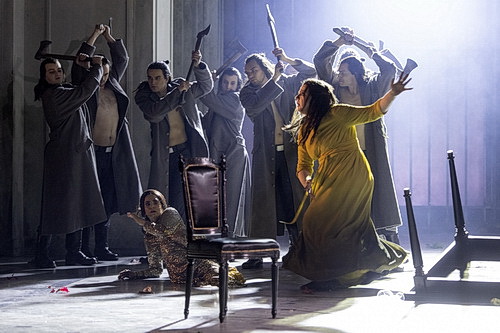 Großartig gelingt das – abgesehen vom Finale – in der Erkennungsszene der Geschwister sowie in der langen Begegnung von Mutter und Tochter, Klytämnestra und Elektra, den Kernstücken des Werks. Insbesondere in diesen beiden Schlüsselszenen präsentiert Asszonyi ihre Kompetenz in der Bewältigung fordernder Partien im hochdramatischen Fach. Ihr ausgereifter Sopran bewegt sich souverän zwischen den dunklen Gefilden wie den lyrischen Höhen dieser monströsen Seelenlandschaft. Nicole Piccolomini ist im goldschimmernden Paillettenkostüm als Klytämnestra gewiss die zutiefst verdorbene femme fatale mit schneidendem Mezzo auf dem Thron der Verbrecherclique. Gänzlich ohne Format und Würde mag aber Lübbe diese Erscheinung nicht zeigen. Respekt und Wärme eignet er erst recht Manuela Uhl als Chrysothemis zu, der Schwester und weiblichen Gegenspielerin Elektras. Es gehört zu den außerordentlich anrührenden Sequenzen dieser Aufführung, wie sie in diesem Inferno für ihr Recht auf eine selbstbestimme Existenz kämpft. Wie sie Elektra um Menschlichkeit anbettelt, wo der Hass alles Menschliche erstickt: Hab Mitleid mit dir selbst und mit mir. An diesem Abend der starken Frauen, machen auch das Quintett der Mägde sowie der Chor und die Statisterie des Theaters Bonn bella figura.