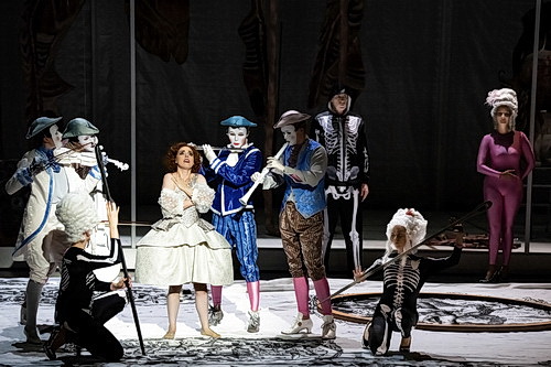 Das Beethoven-Orchester Bonn mit Hermes Helfricht am Pult hat sich, wie aus dem Graben zu vernehmen ist, mit der Partitur in den Proben richtig angefreundet. Es trifft die eleganten wie die robusten musikalischen Linien, die eben „lärmen machen“ sollen, vorzüglich. Dieser Form passt sich der von Marco Medved einstudierte Chor mustergültig an, wobei offenbleibt, ob trotz oder gerade wegen der unglücklichen Maskeraden, die ihm die Regie abverlangt.