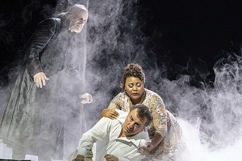 Im Quartett der Hauptpartien gibt es viel Qualität, jede Menge Verdi-Spirit, aber dank eines weitgehend unnatürlichen Vibrato bei den Sängerdarstellern von Elvira und Don Carlo ein phasenweise eingeschränktes Vergnügen. Der Tenor George Oniani, einst Mitglied des Bonner Ensembles, überzeugt als Ernani mit strahlendem Timbre und metallischer Höhe. Mit seiner Dell‘esilio nel dolore gleich von Beginn an. Der Bariton Federico Longhi, Gast in der Rolle des Don Carlo, gibt die Charaktermaske des Königs mit darstellerischer Präsenz und vokaler Intensität. Bestechend agiert der Bass Pavel Kudinov, der die ihm im Spiel abverlangte Gebrechlichkeit des Alters durch vokale Kraft, Brillanz und Nuancenreichtum glatt vergessen lässt.