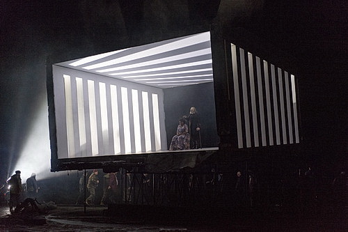 Regisseur Schwab lässt die vier Akte in einem schräg gestellten, drehbaren Kubus spielen, den Alfred Peters in Tuchfühlung mit der großartigen Lichttechnik Boris Kahnerts ersonnen hat. Er dient den Schauplätzen des ersten und des zweiten Akts, Wald und Kastell des Silva, als plastische Kulisse, die links und rechts den Blick auf die reale Bühnentechnik des Bonner Theaters freigeben. Im dritten Akt wird es regelrecht imposant. Aus der Aachener Kaisergruft fährt die von Hubtechnik angetriebene Bühne den Chor in die Höhe, was noch durch die Nachbildung des Throns Karls V. im Aachener Dom übertroffen wird, auf dem sich der Herrscher selbst zum Kaiser des Heiligen Römischen Reichs krönt. Es ist der einzige Moment, in dem der Purpur des Regenten neben dem weißen Kleid Elviras die schwarzen Kostüme Renée Listerdals durchbricht, die ansonsten die Düsternis des Geschehens unterstreichen.