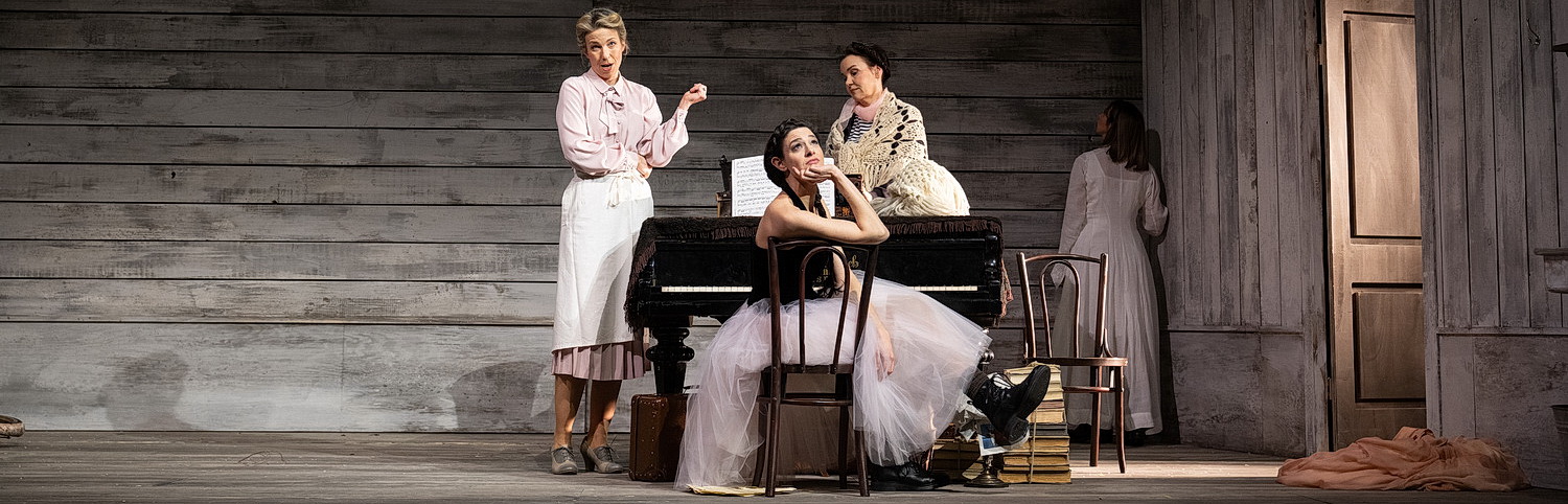 Diese Schräge aus Holzplanken gibt es auf der Bühne des Bonner Hauses auch tatsächlich. Von links oben nach rechts unten verläuft sie, um im ersten und zweiten Akt wechselnde Schauplätze für allerlei Verweilen und Treiben zu schaffen. Nach der Unterhaltung, die die vornehme, aber verarmte Witwe Larina auf ihrem Landgut mit ihren beiden Töchtern sowie der alten Amme Filipjewna führt, verschanzen sich Tatjana und Olga gleichsam unter dem Balken. Ein Bild für das Oben und Unten in dieser Familie.