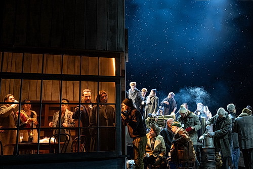 Auf der Schrägen trifft sich die Dorfjugend alias der Chor des Theaters zu allerlei Spaß. Der Dorfgesellschaft mit Mützen aus Bärenfell und Pelzmänteln dient sie als willkommene Piste und Eisbahn zum winterlichen Vergnügen. Da sausen die jungen Leute auf Kufen oder in ihren Schlitten die Schräge hinab, fliegen die Schneebälle. Die bekommt auch Onegin ab, woraus abzulesen ist, was man im Dorf von ihm hält. Bewegung, nicht Stillstand ist die Devise dieser Regiearbeit. Mit einem Fahrrad umkurvt Olga ihren Lenski, während der mit dem Arioso Ja, ich lieb‘ Sie, Olga seine schwärmerischen Gefühle verrät.